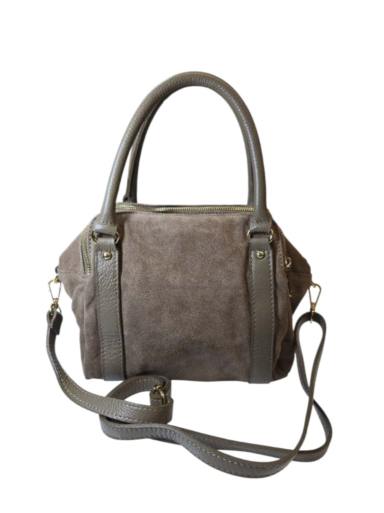 Raffinata e versatile, questa borsa a mano grigia in pelle e suede è l’accessorio ideale per accompagnarti ogni giorno con stile. Il design morbido e leggermente strutturato è impreziosito da finiture dorate e una chiusura con zip che garantisce praticità e sicurezza. Dotata di doppi manici rinforzati e tracolla regolabile e rimovibile, può essere portata a mano o indossata a spalla per un look più casual.