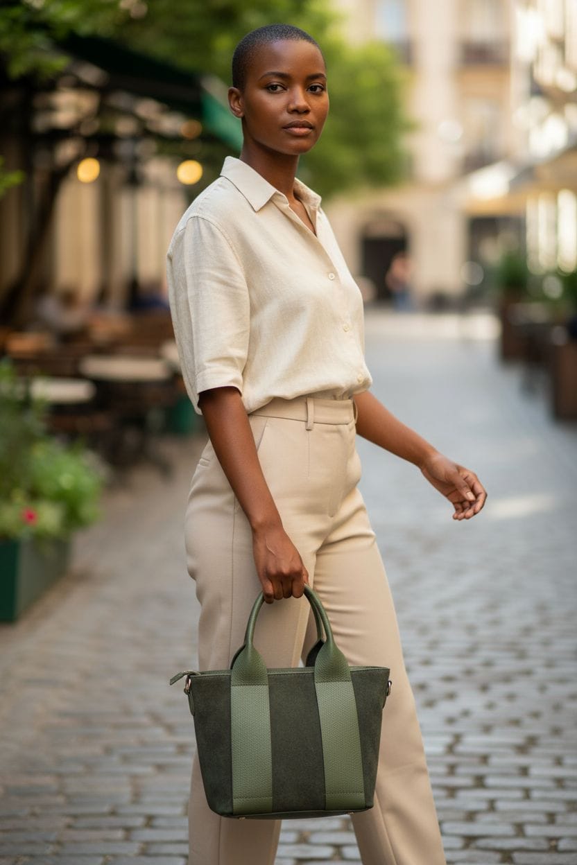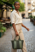 Moderna, compatta e raffinata: questa borsa a mano verde in pelle e suede è l’accessorio perfetto per chi ama lo stile minimal ma curato nei dettagli. Il design lineare con doppio manico ampio e le fasce laterali in pelle donano struttura e carattere. Grazie alla tracolla regolabile e rimovibile, può essere indossata anche a spalla per un look più casual e pratico.