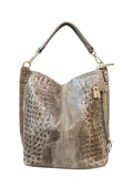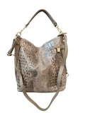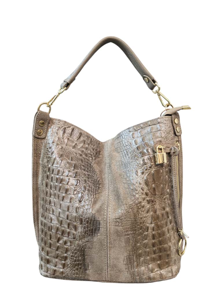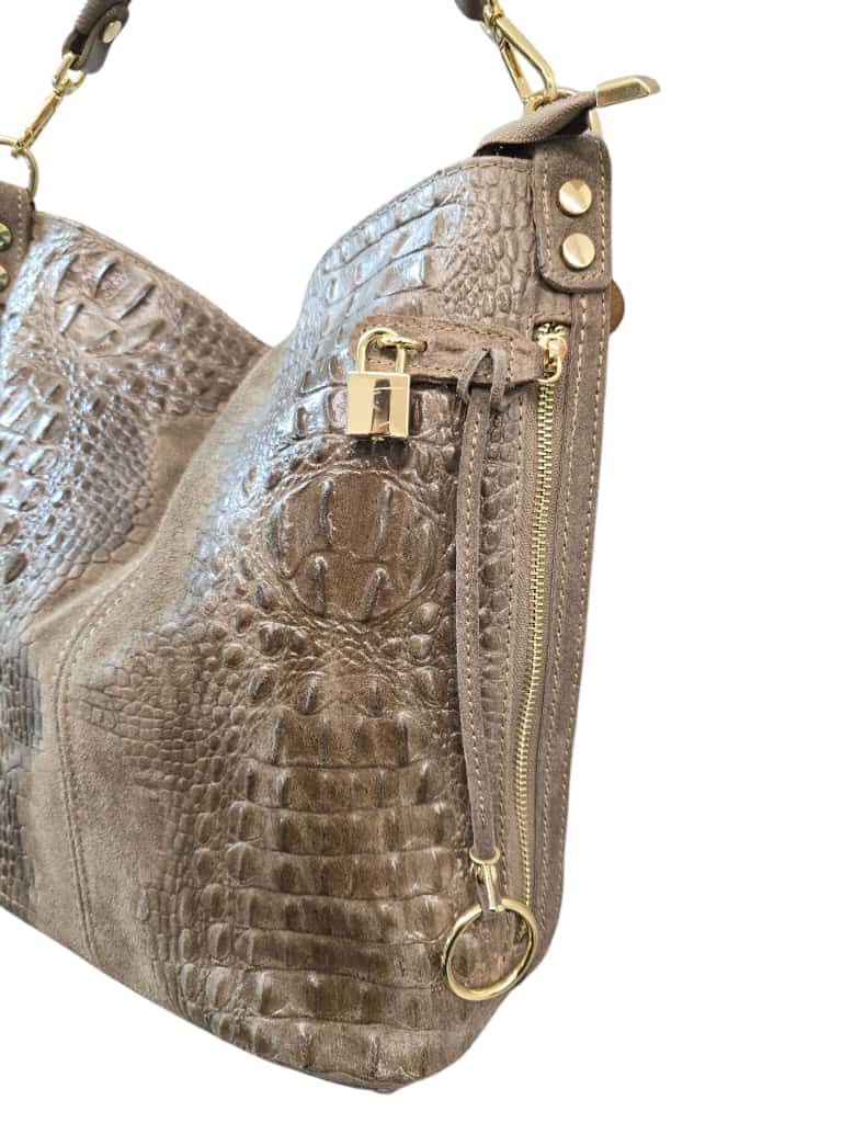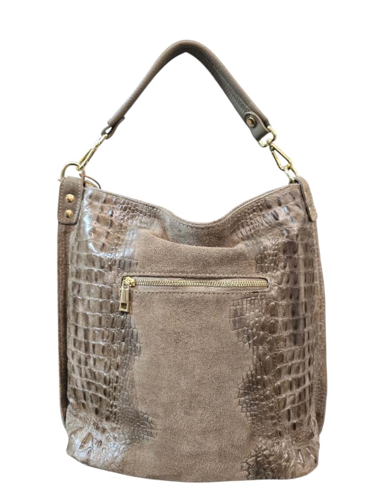 Una borsa dallo stile deciso e raffinato, realizzata in vera pelle con effetto pitonato e finitura metallic bronzo. Il suo design morbido e capiente è arricchito da finiture dorate e da una zip laterale decorativa che aggiunge carattere e luminosità. La tracolla ampia e rimovibile garantisce praticità e comfort, rendendola perfetta per l’uso quotidiano o per un look serale elegante.