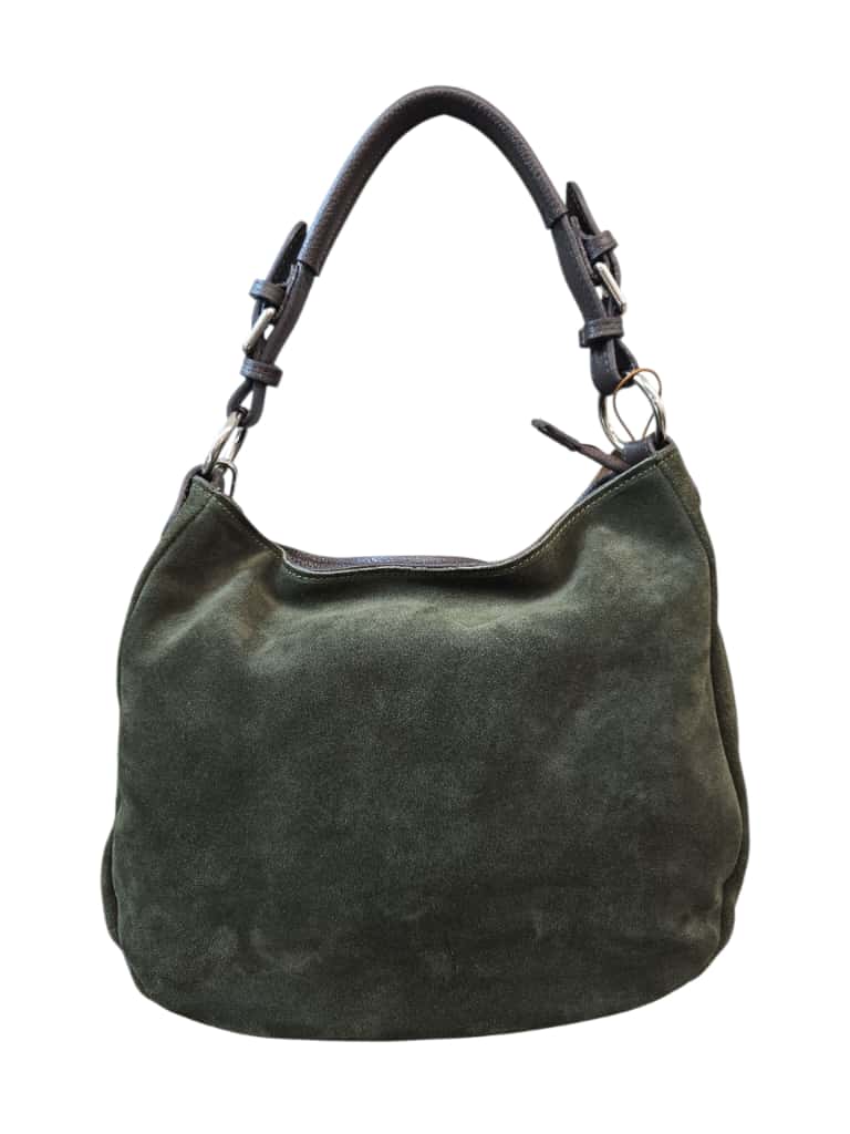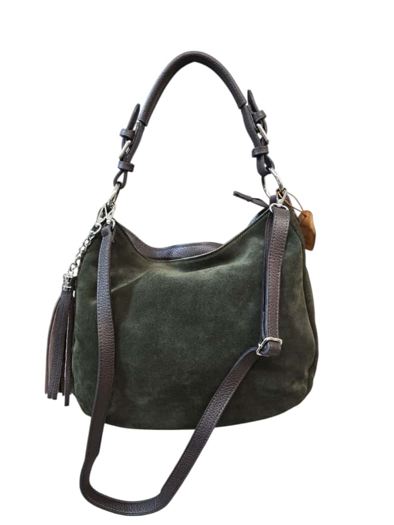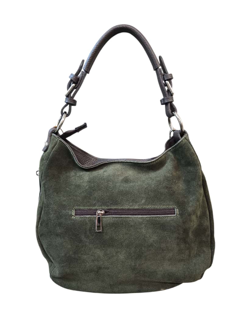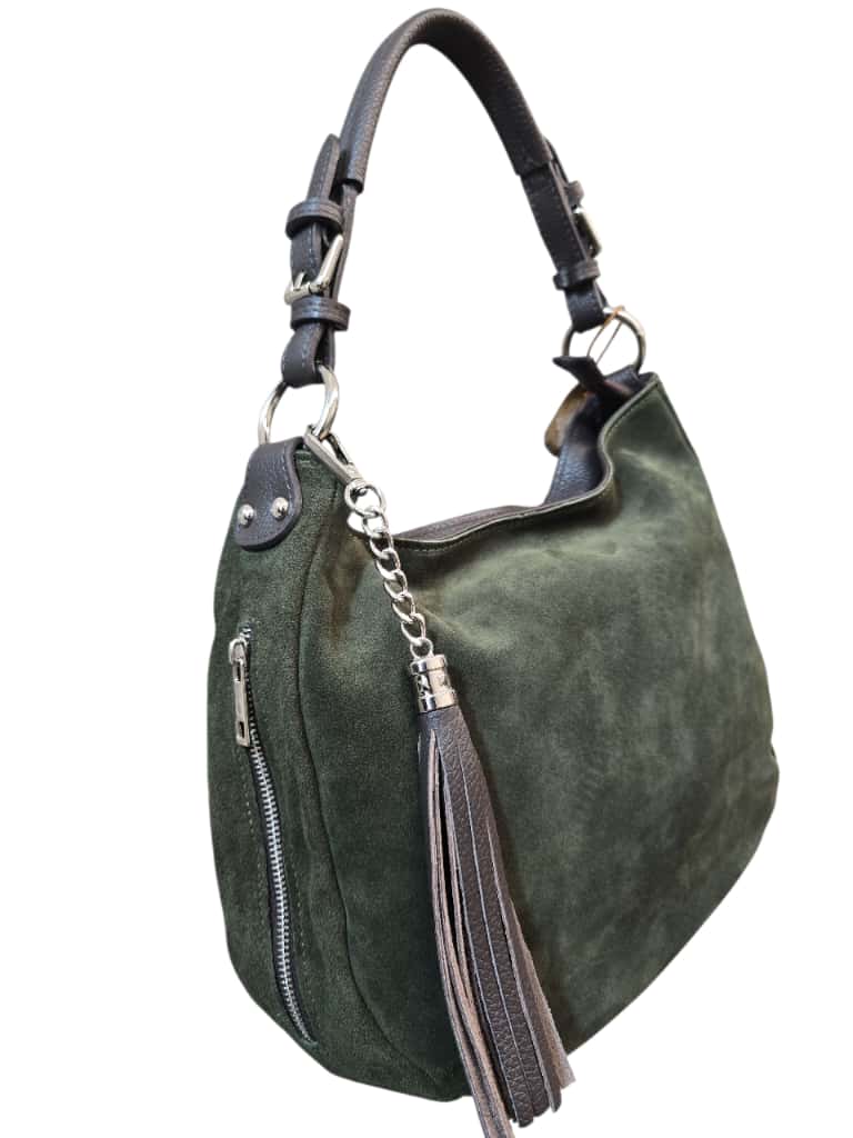 Una borsa dallo stile contemporaneo e sofisticato, realizzata in morbido suede verde con dettagli in pelle liscia e finiture metalliche argento. L’elegante nappina decorativa e la catena laterale donano carattere e personalità, mentre la zip laterale funzionale aggiunge praticità. Il manico ampio e strutturato garantisce una comoda vestibilità sia a spalla che a mano.