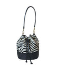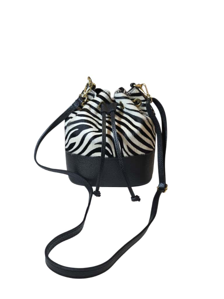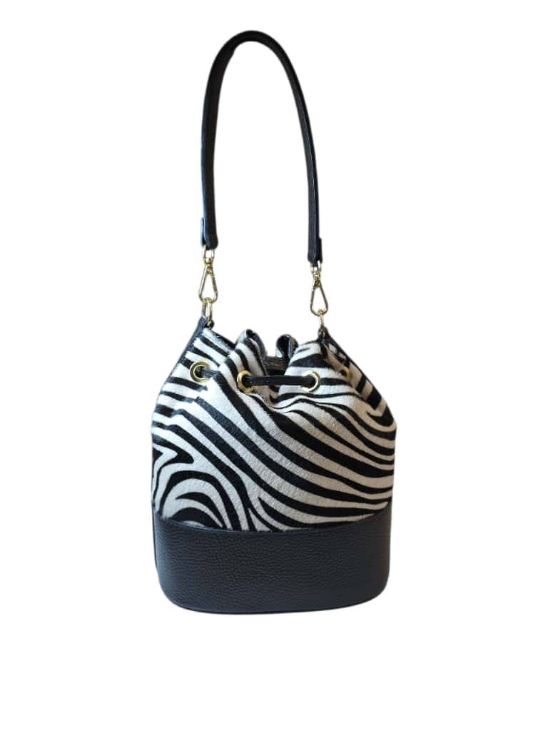 Borsa secchiello in cavallino zebrato e pelle nera con dettagli dorati e tracolla rimovibile