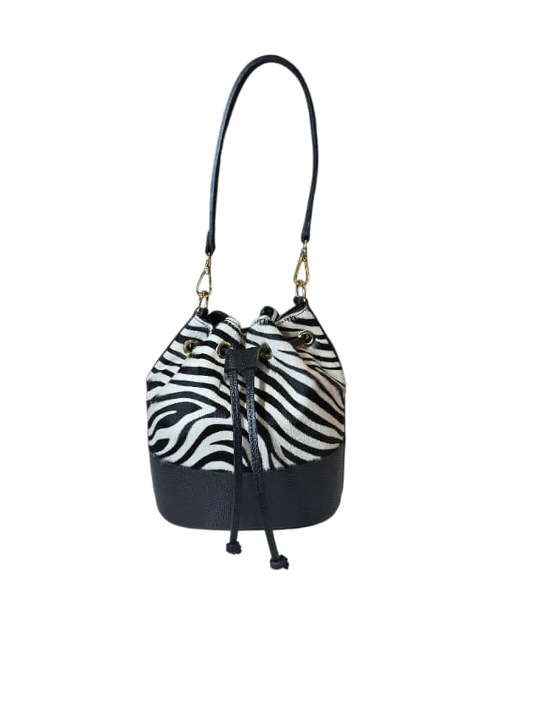 Un accessorio grintoso e raffinato: questa borsa secchiello in cavallino zebrato e pelle nera è la scelta perfetta per chi ama distinguersi con stile. Il design moderno con chiusura a coulisse e finiture dorate esalta la texture naturale del cavallino, donando eleganza e carattere a ogni look. La tracolla regolabile e rimovibile e il manico superiore la rendono pratica e versatile, ideale sia per il giorno che per la sera.